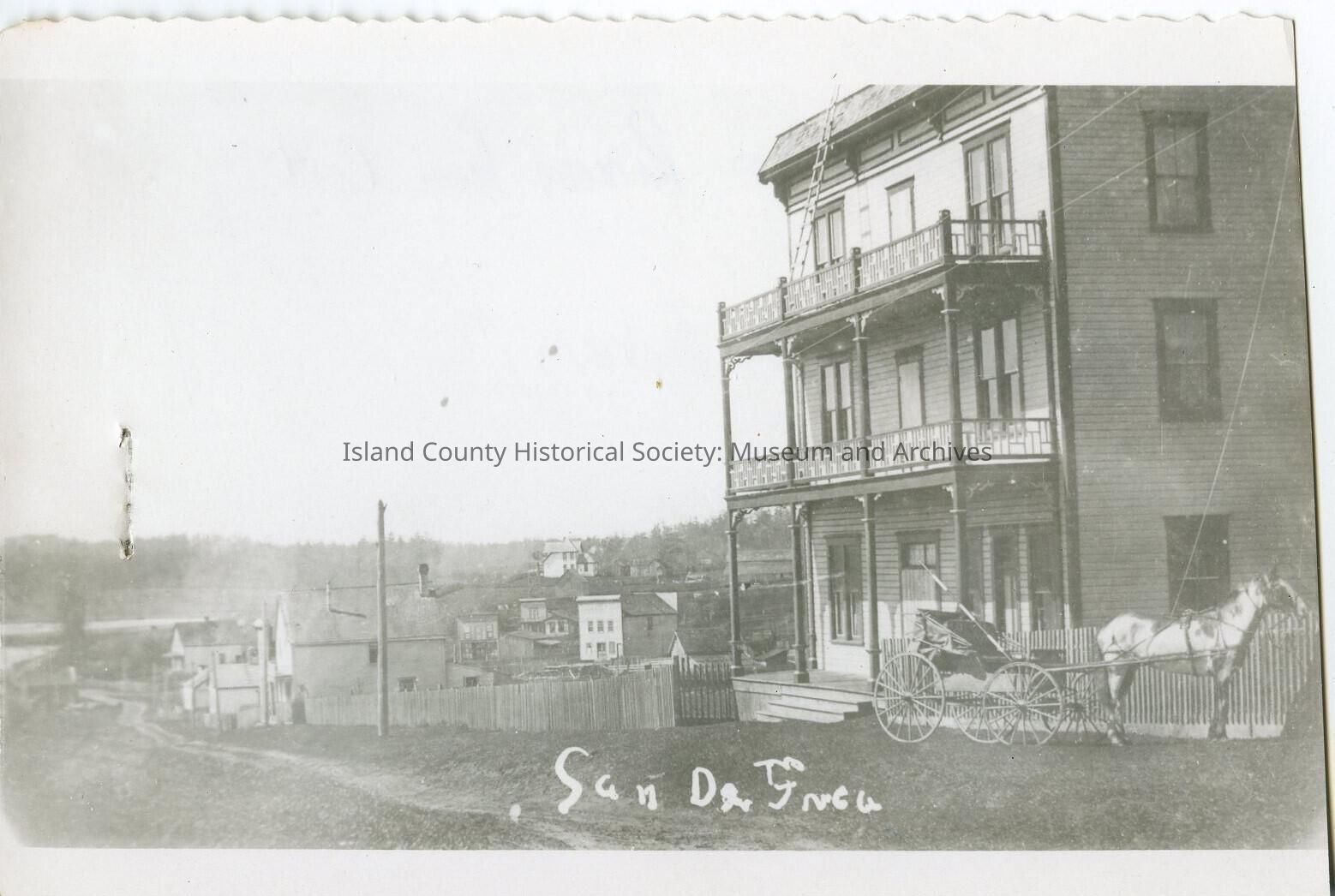 Photo of the San de Fuca hotel, a three story wooden structure. Outside the hotel is a horse and carriage.