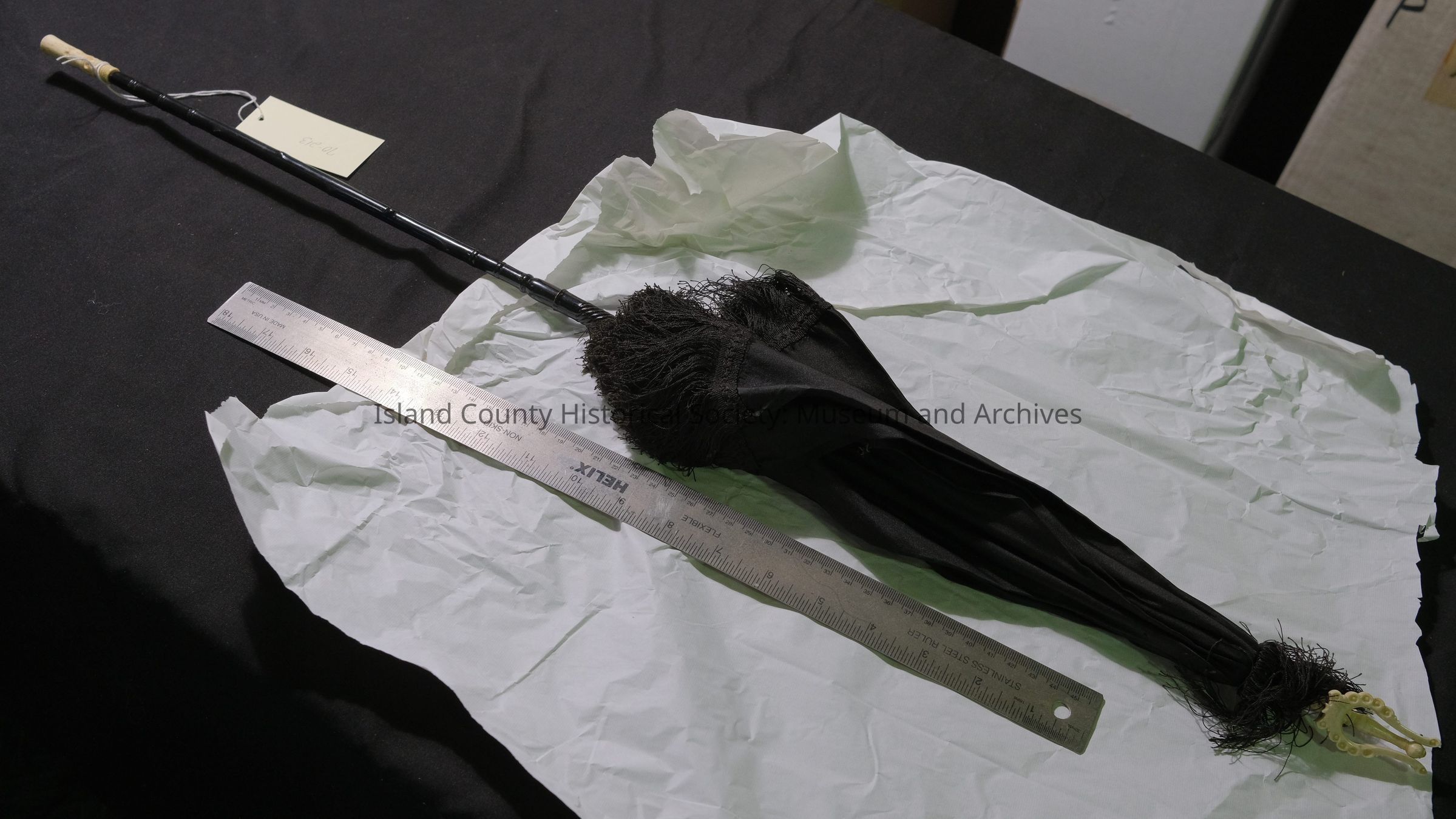 Black Santeen Sunshade-folding handle- ivory trim on top and handle.