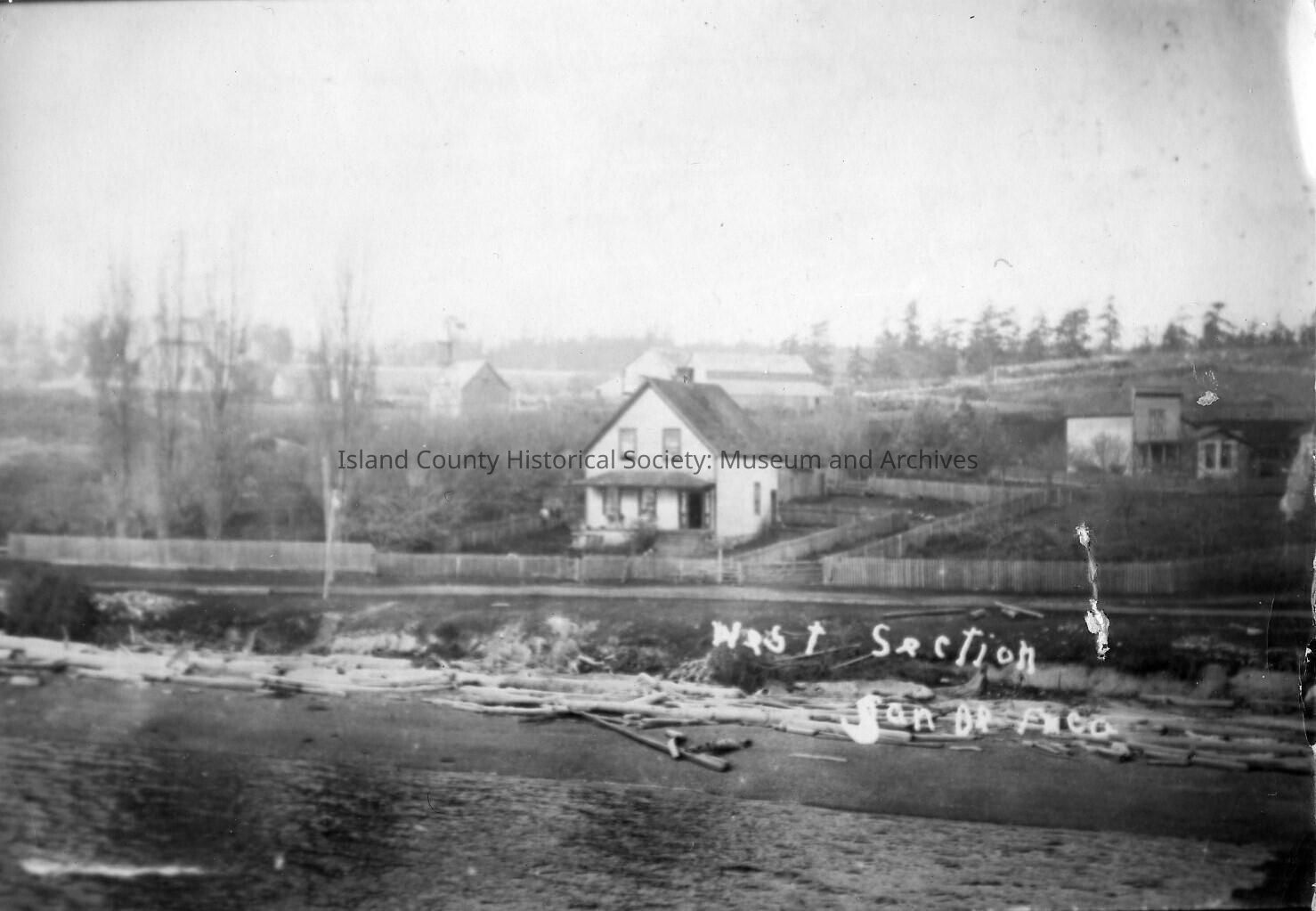 Photo featuring a large white house on the beach, front of photo reads: West Section San de Fuca.