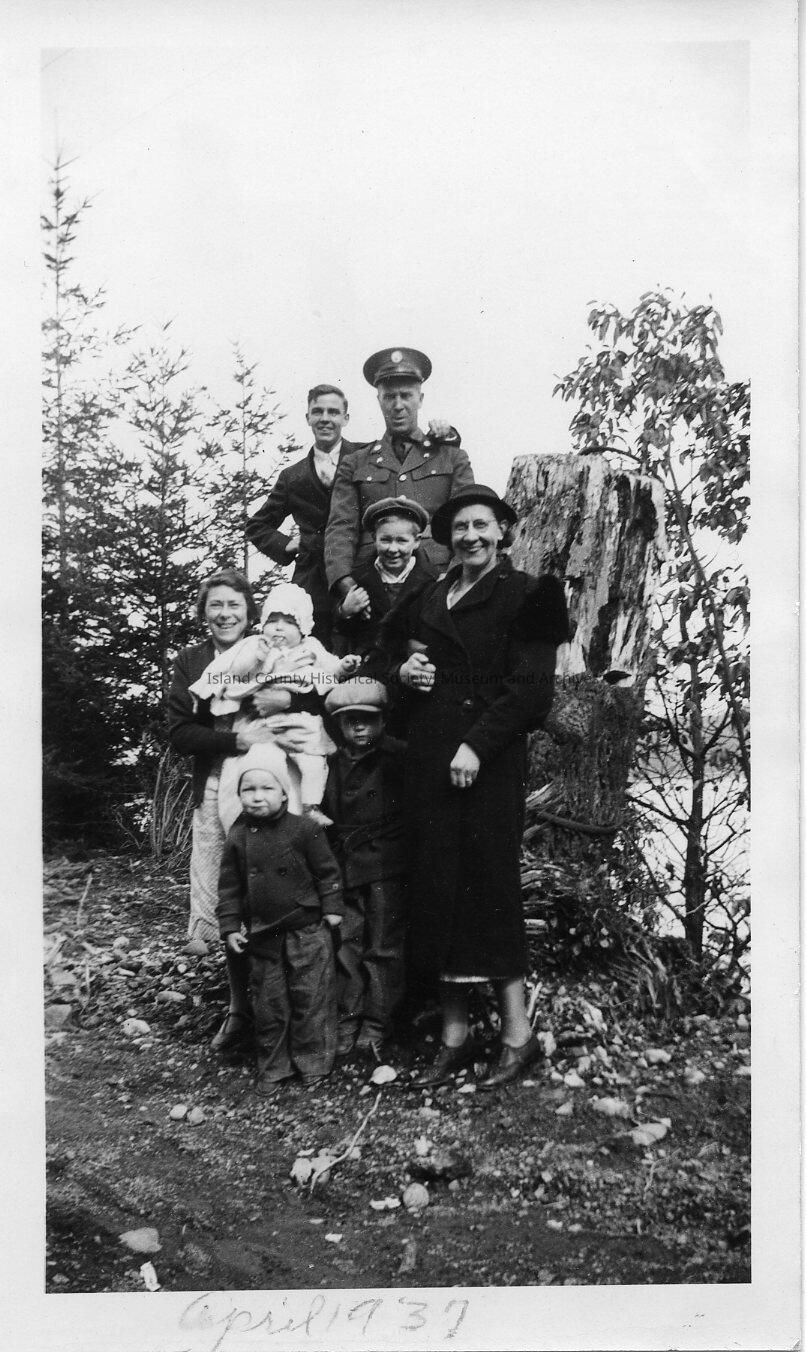 Group photo of a military man, a man, three children and two women standing around and on a large tree stump. Taken April 19th 1937.
