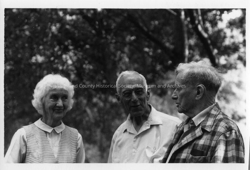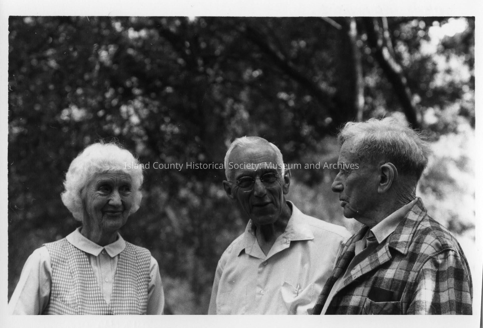 Old timer's picnic Group of three people standing around talking, two men and one woman. On the back: Pearl Singer, Everett Jenne, Carl Gillespie