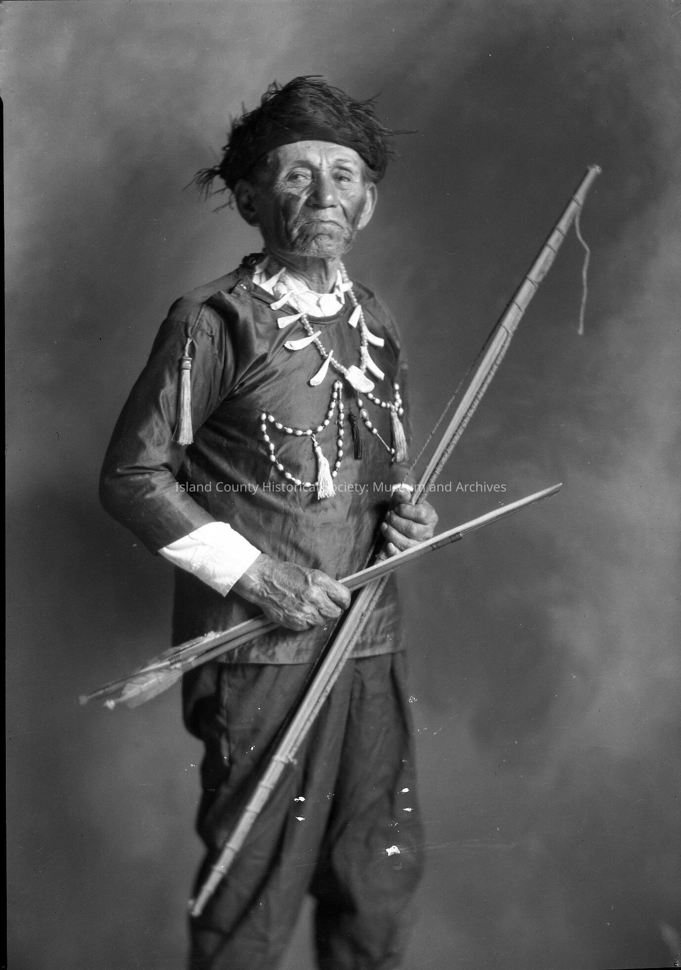 Negative of a Native American man from the Lummi Tribe. In the picture the man is holding his bow and two arrows and wearing an outfit adorned with shells, beads, and tassels. He has a painted design on his cheeks and is wearing a hat of feathers or hair.