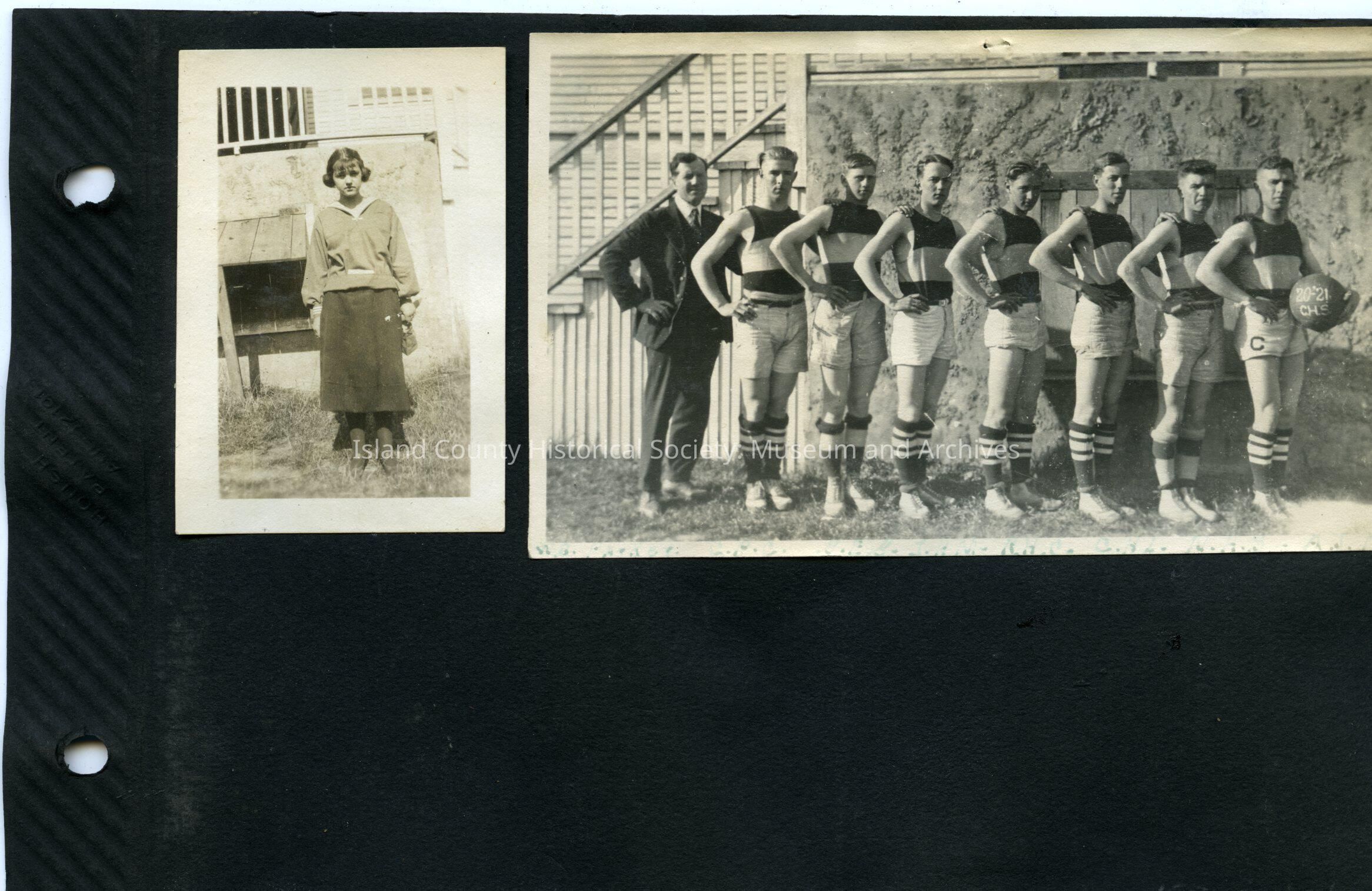Right: Group of seven athletes and one coach in a suit. The seven are wearing striped knee-high socks, high-top sneakers, shorts, three-striped shirts. One is holding a ball labeled 20-21 CHS and has a C on his shorts (probably for captain). Caption - probably intials. 3" X 5"