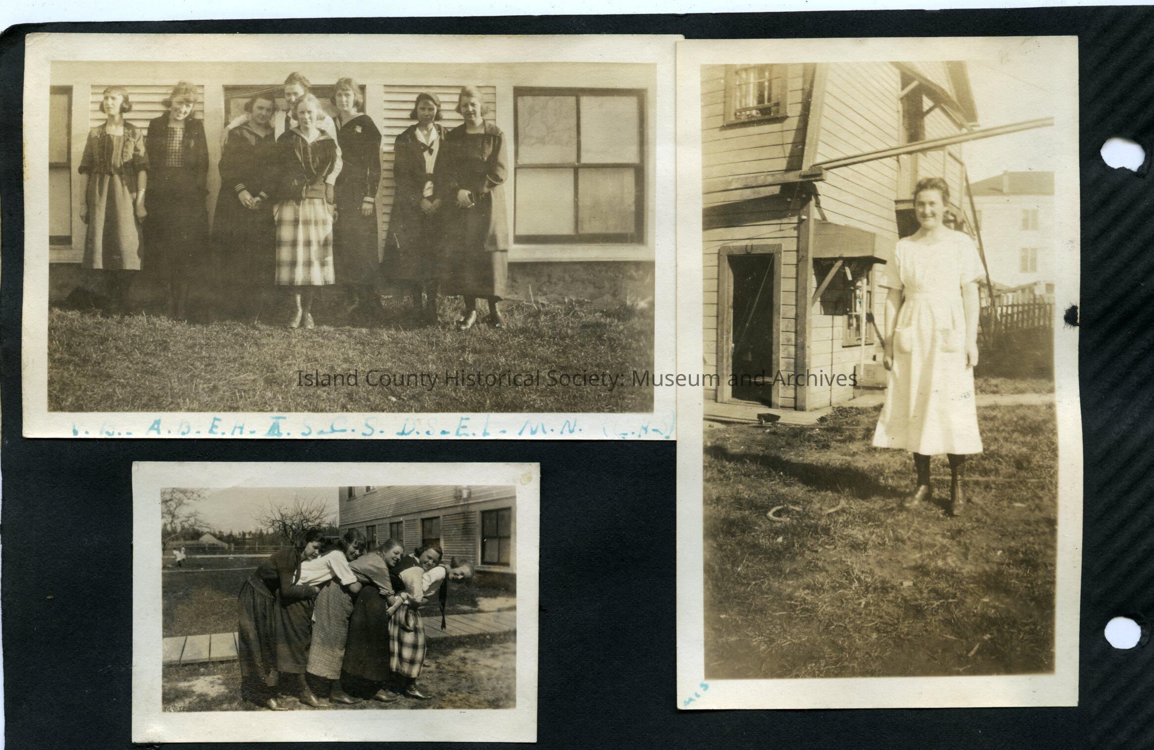 Left: Group of eight women in front of a wood building. Two on the right look older - maybe teachers. Caption: Initials. C.H.S.! 3.25" x 5"