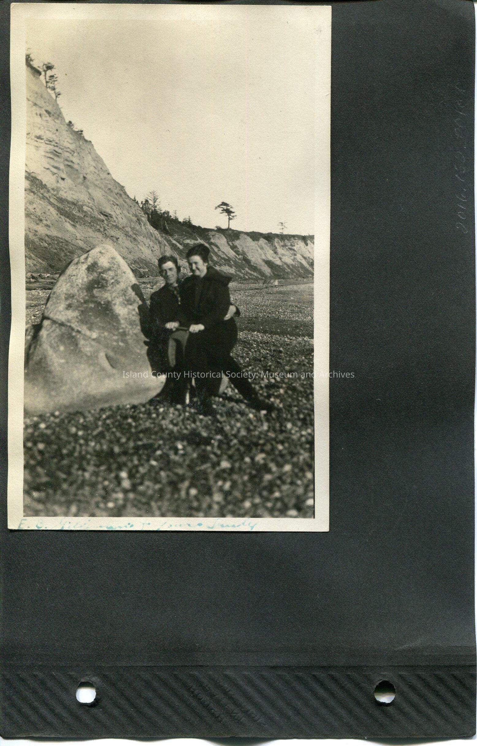 Man in a suit holding a woman on his knee. They are sitting on a large pointy rock on a rocky coast or beach. Bluff with a few trees behind them. Caption: .... yours truly .. 3.5" x 5.75"