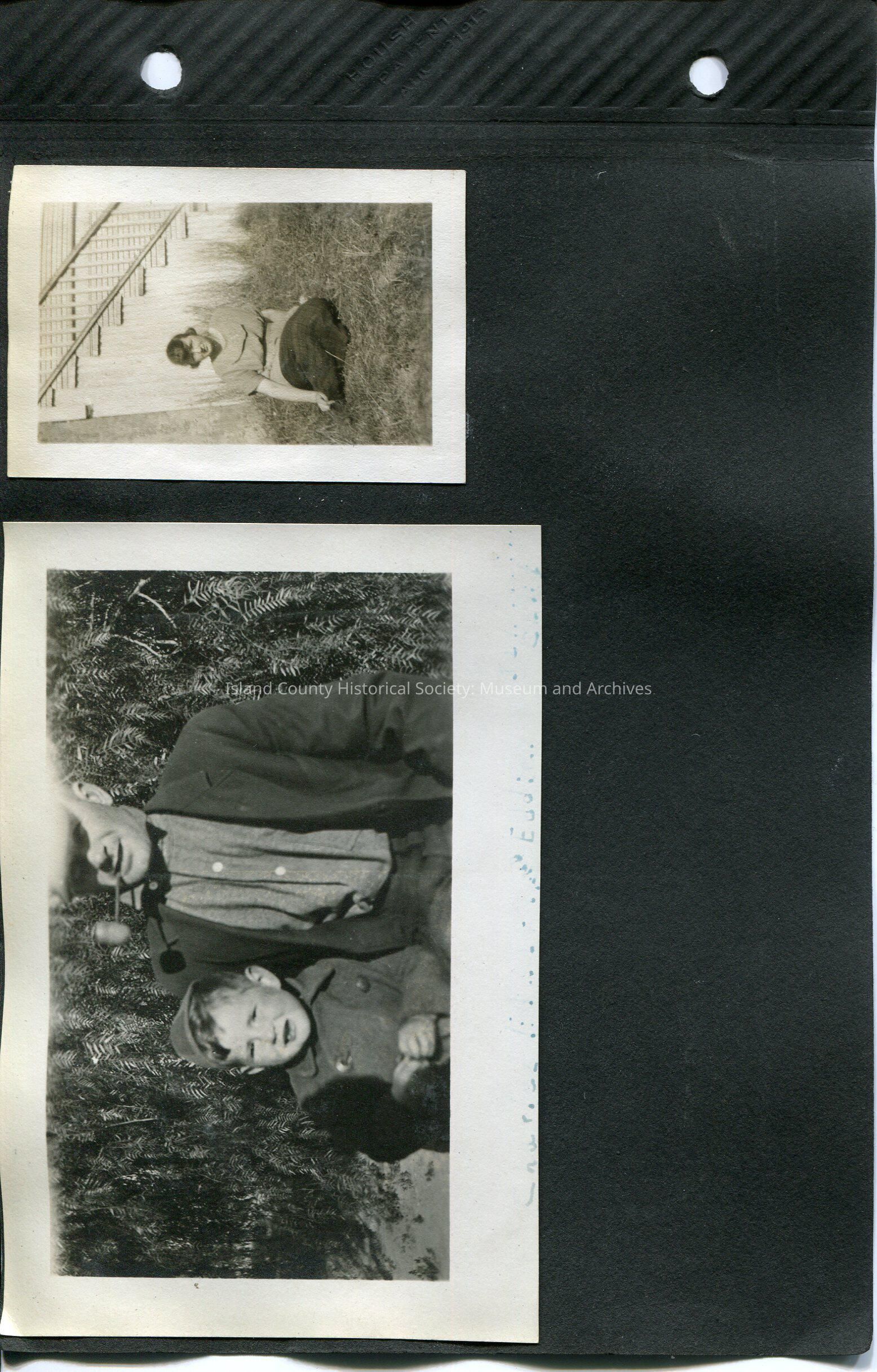 Left: Man smoking a corn cob pipe beside a small boy wearing a jacket and cap. Crops of some sort behind them. Caption: Charles (?) and Edie ... illegible.. 4.75" x 3.25"