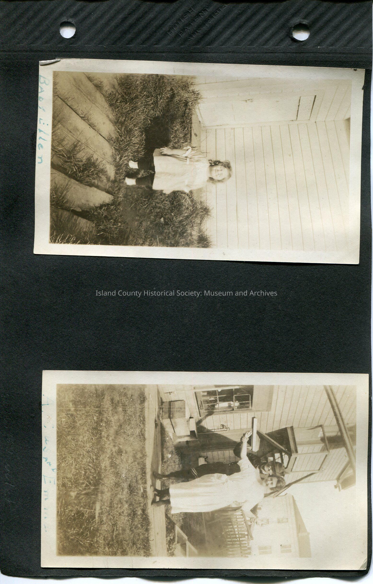 Left: Little girl in a dress, ringlets and smiling with her eyes closed. She is standing in the grass beside a wooden walkway and in front of a wood building. Caption: Baby Ellen 2.75" x 4.5"