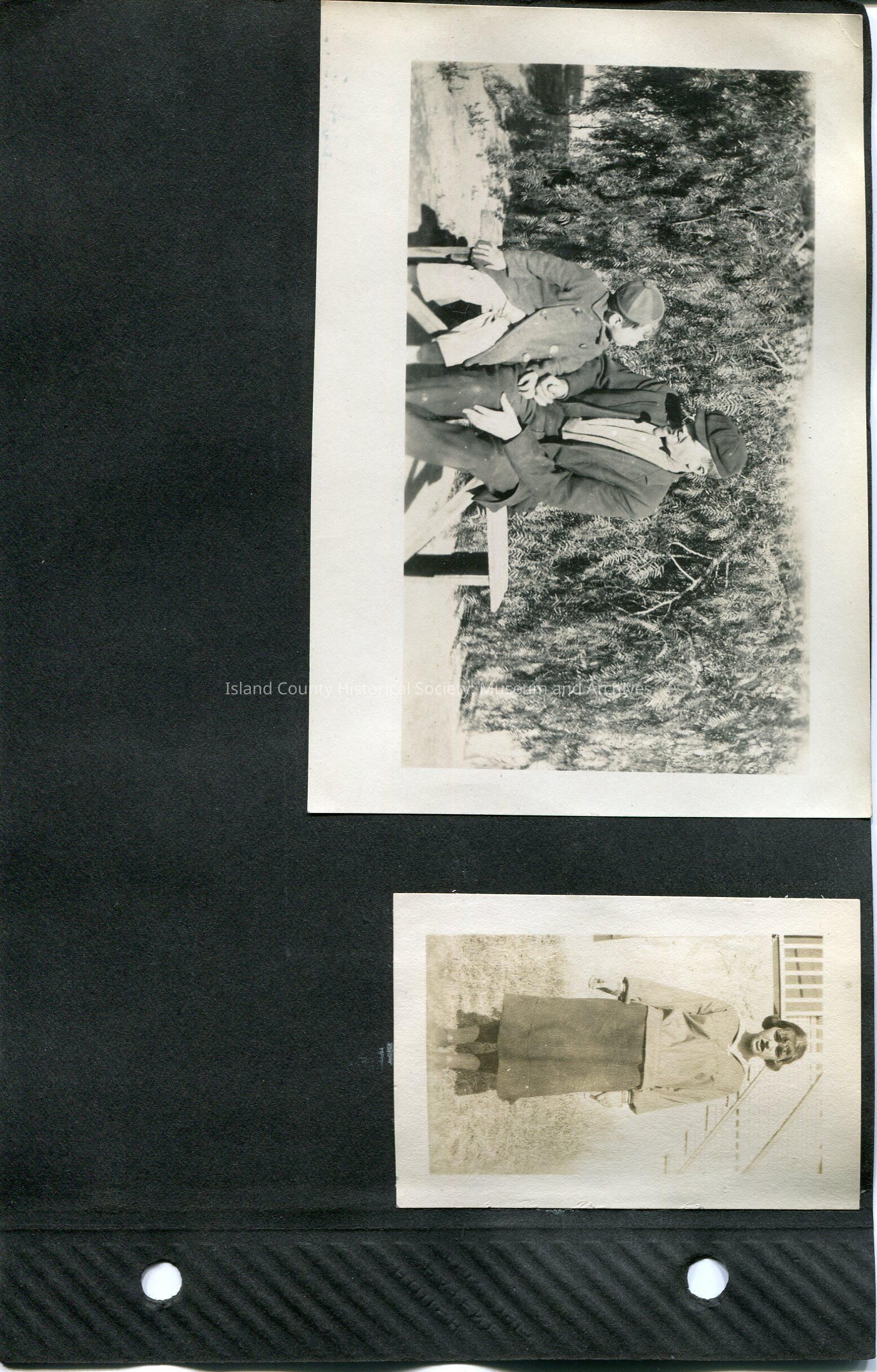 Left: Man smoking a corn cob pipe beside a small boy wearing a jacket and beanie cap. They are seated on a bench and looking at each other. Crops of some sort behind them. 5.75" x 3.25"