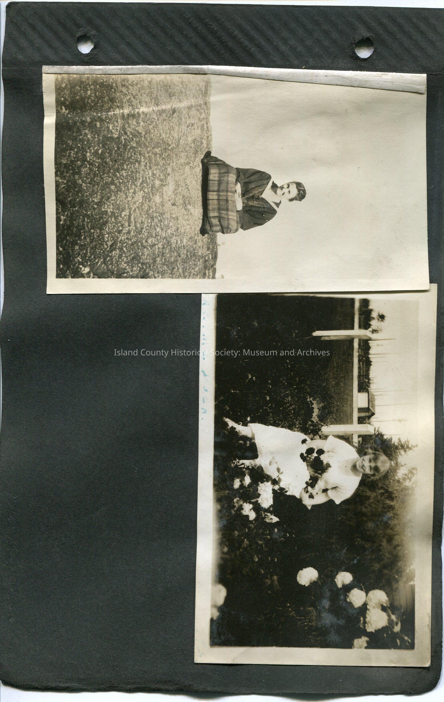 Right: A girl in a dress is sitting, laughing, holding a large bouquet of flowers in her lap. A fence and more flowers are behind her. Caption: Thelma & Dock 2.75" x 4.5"