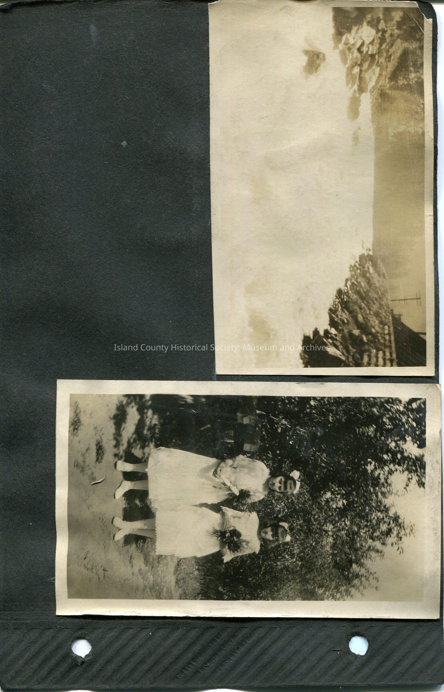 Right: Two girls in dresses standing on grassy path holding a large bouquet of flowers. Bows in their hair. Diplomas in their hands. Two mail boxes just visible behind them. 2.75" x 4.5"
