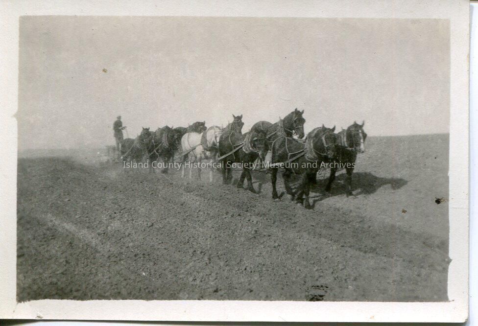 Team of 10 horses in twos pulling farm plow or sledge or sled (can't see it). Man is standing on top of it holding the reins. Possible tilling the fields.