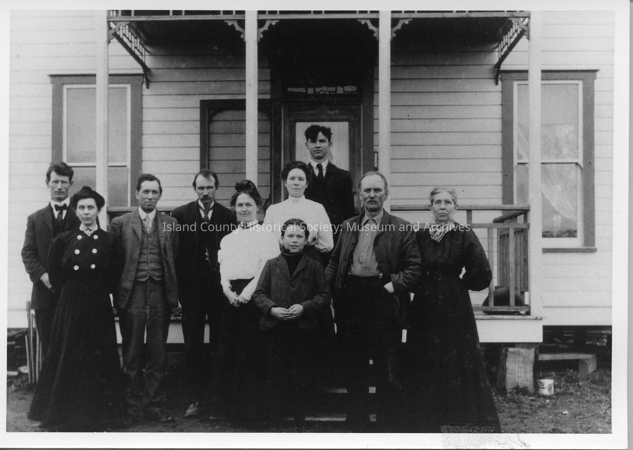 A photo of the Sanford Home - Freeland. The people standing outside are Alonzo C. Malin, Myrtle Belle Sanford Malin, DeForest Sanford, Bert Sannford, Ethel Brooks Sanford, Grace Sanford, Claude Sanford, Wm R Sanford, Emily Burbank Sanford, Marvin Sanford (son of DeForest).Lexicon