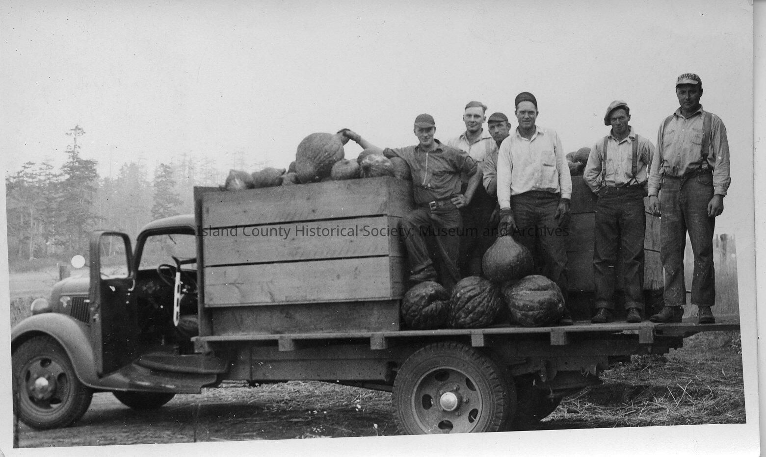 A photo of Sherman family people on the back of a truck. Inside the wooden crate are what looks like squash. On the back: Oct. 21, 1938