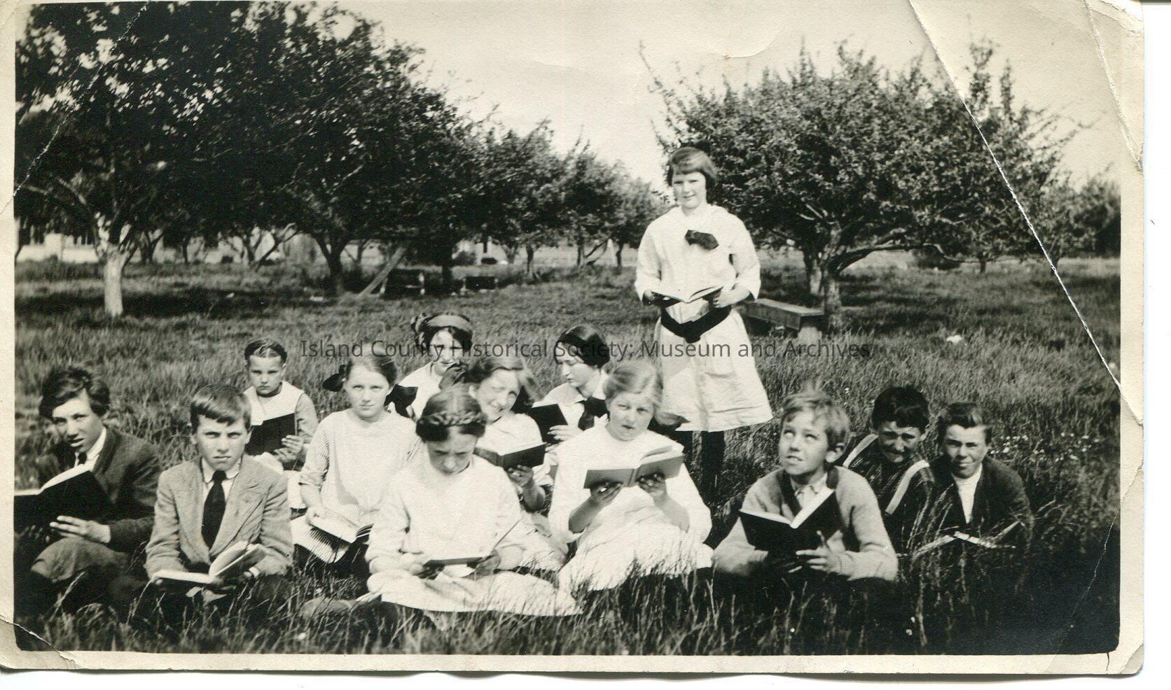 A group of boys and girls reading while sitting or lying in the grass in an orchard. One girl is standing while holding her book. One boy has his head raised and looking up to his right. Girl in front center has elaborate braid twined around her head. Some boys in suits. Girls in dresses. One girl has a hat.