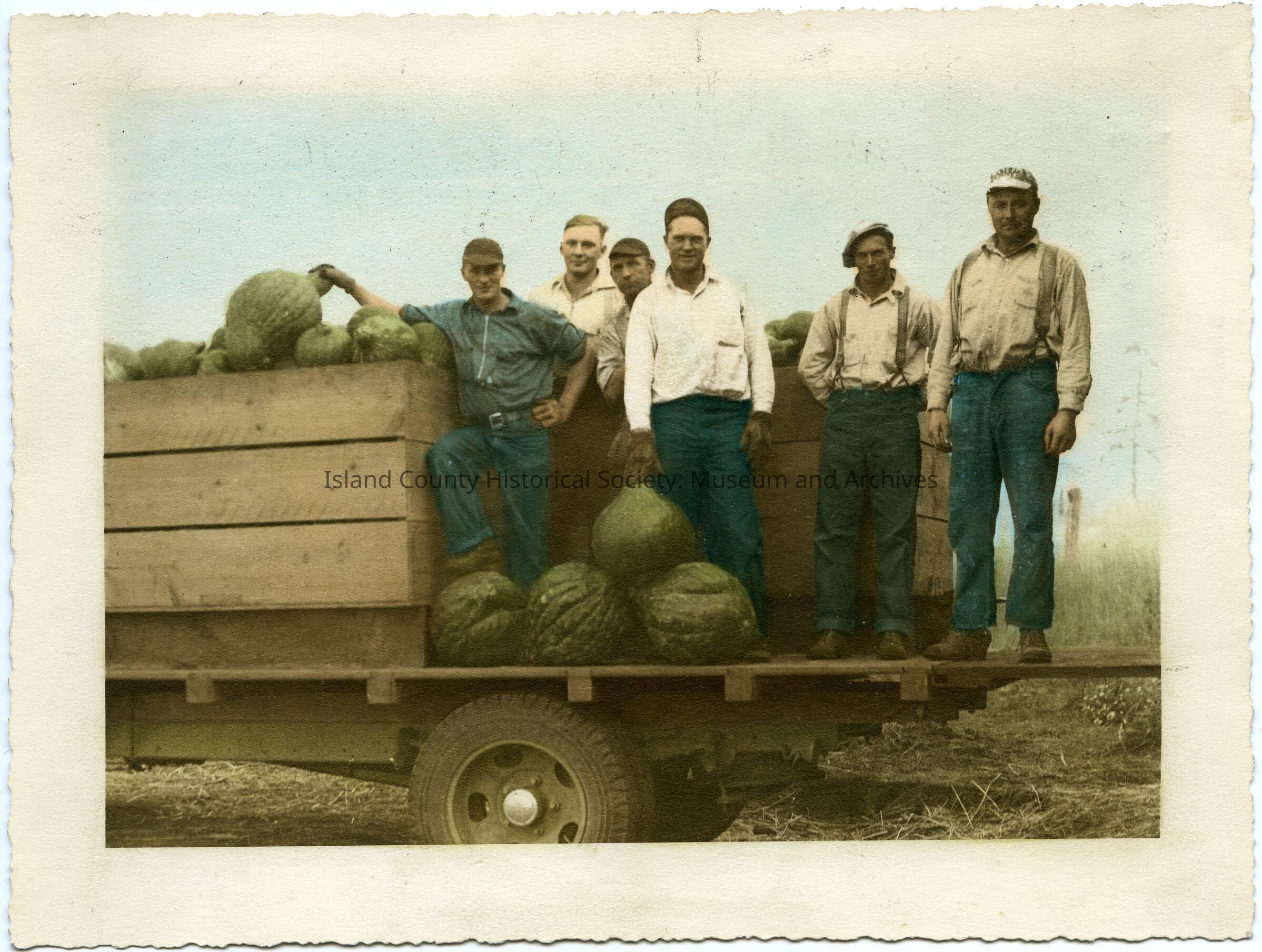 A color photo of Sherman family, people on the back of a truck. Inside the wooden crate are what looks like squash. On the back: Photo by: Sterling E. Anderson, friend of Wilbur and Grace Sherman. Sherman Family.