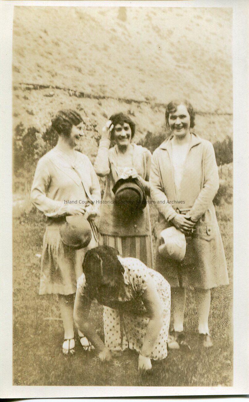 Four young women standing in front of a bluff. Three are holding their hats. One is kneeling on hands and knees in front of them facing the camera.
