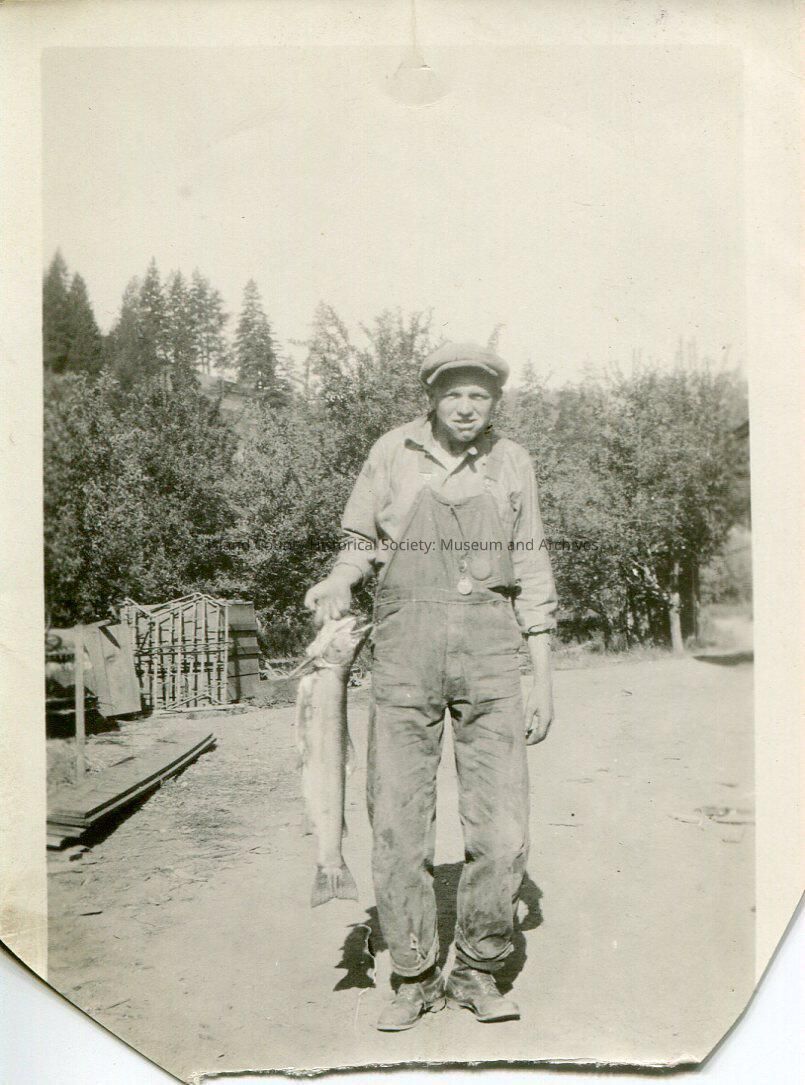 Man wearing overalls, flat cap. Hunched a bit. Smiling. In right hand holding large fish - reaches from his waist to mid-calf. Gate behind him. He is standing on a dirt road. Trees.