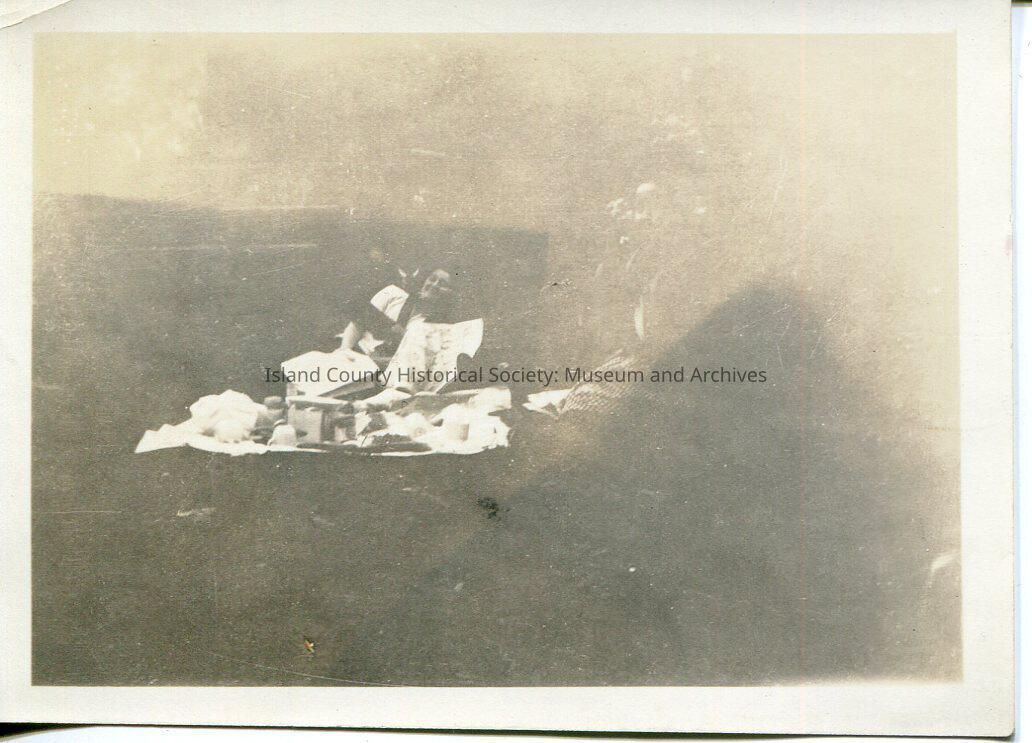 Very dark photo. Woman reclining possible on the ground. Might be debris from a picnic in front of her.