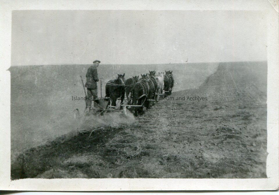 Team of 10 horses in twos pulling farm plow or sledge or sled (can't see it). It has wheels. Man is standing on top of it holding the reins. Possible tilling the fields. This view is from the rear and he is looking back at the camera.