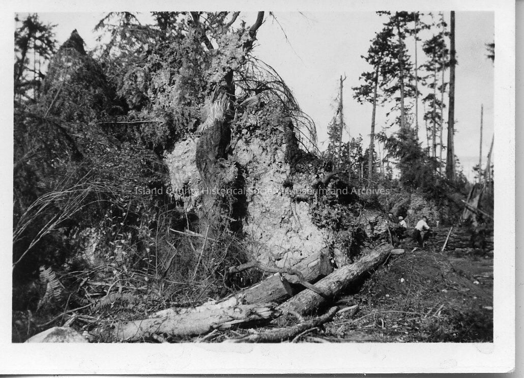 A photo of a huge root ball in a forest with trees cut down, and two men in the distance.