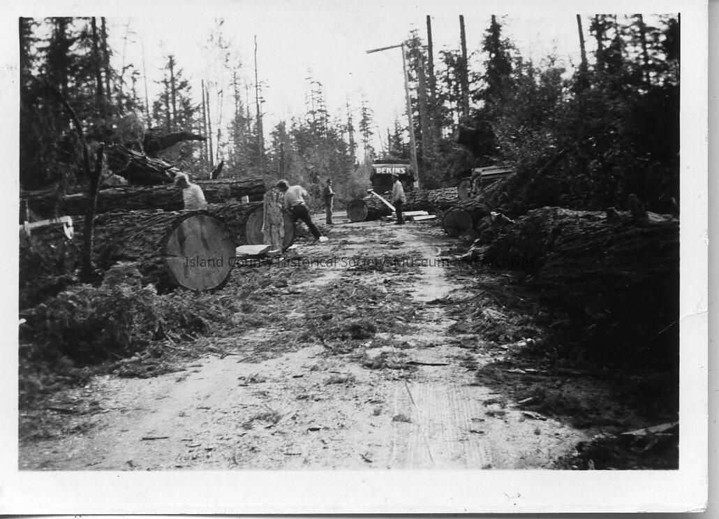 A photo of a forest with trees cut down and several men working.