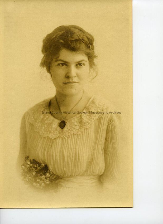 Portrait of a young woman from the Murielle Short collection. Her hair is pinned back, she is wearing a locket and a white dress.