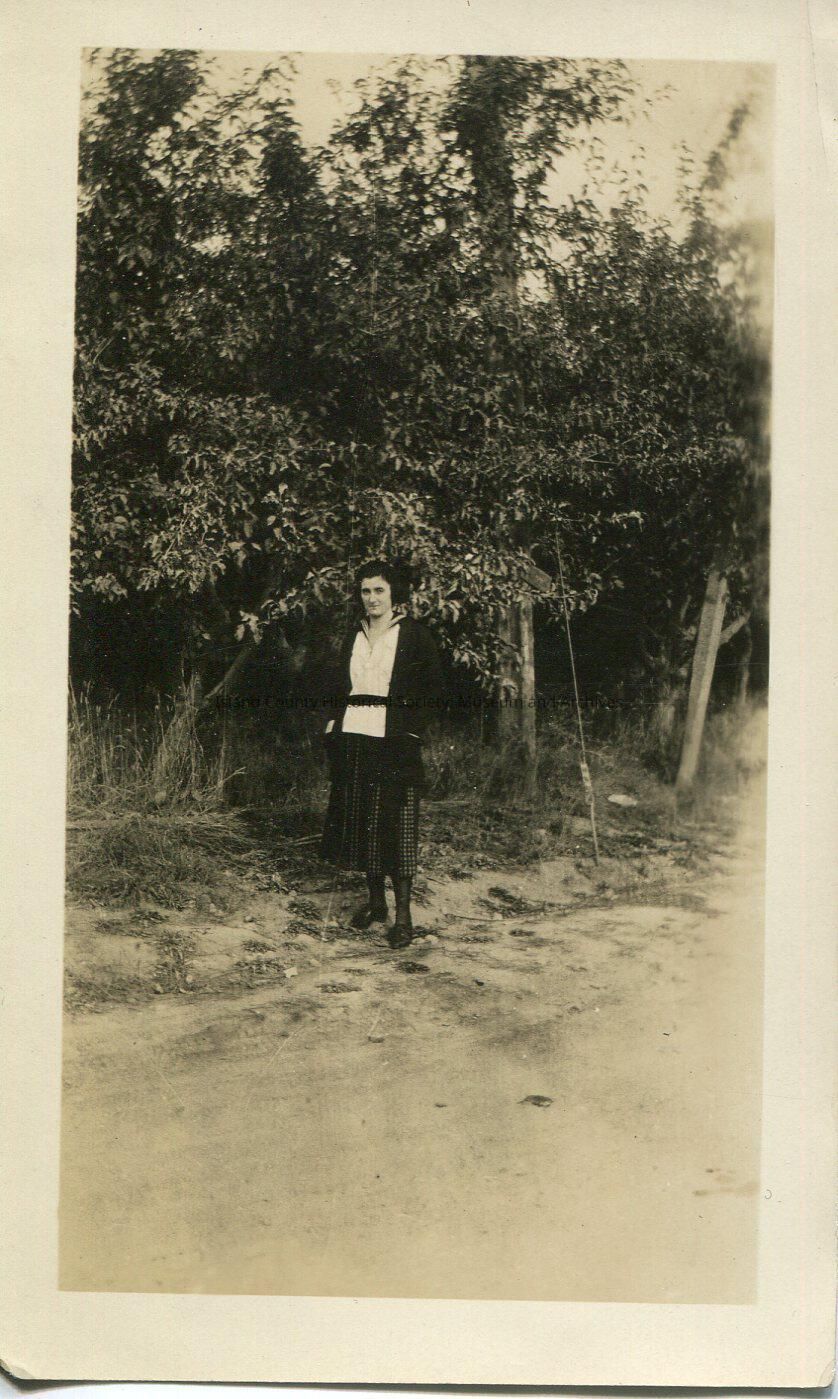 A woman standing on the side of a road, with a large number of trees behind her. She is wearing a dark sweater of a white blouse and has a dark skirt. She has a black belt around her waist.