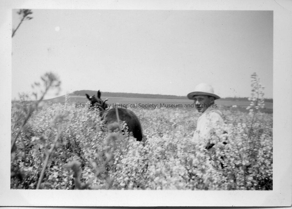 A photo of man and a horse walking through flower bushes. The man is looking back at who took the photo. On the back: 1939.