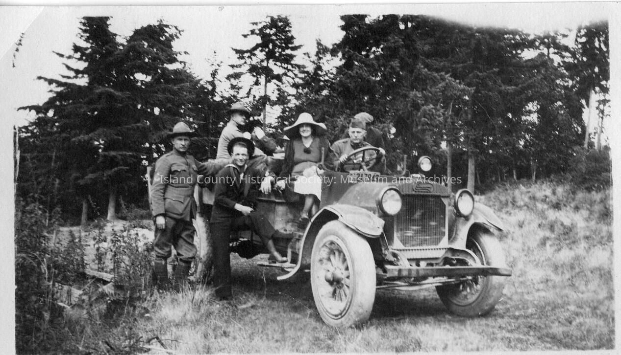 Fort Casey soldiers piled in a military vehicle with several women. The vehicle looks to be parked in a field somewhere.