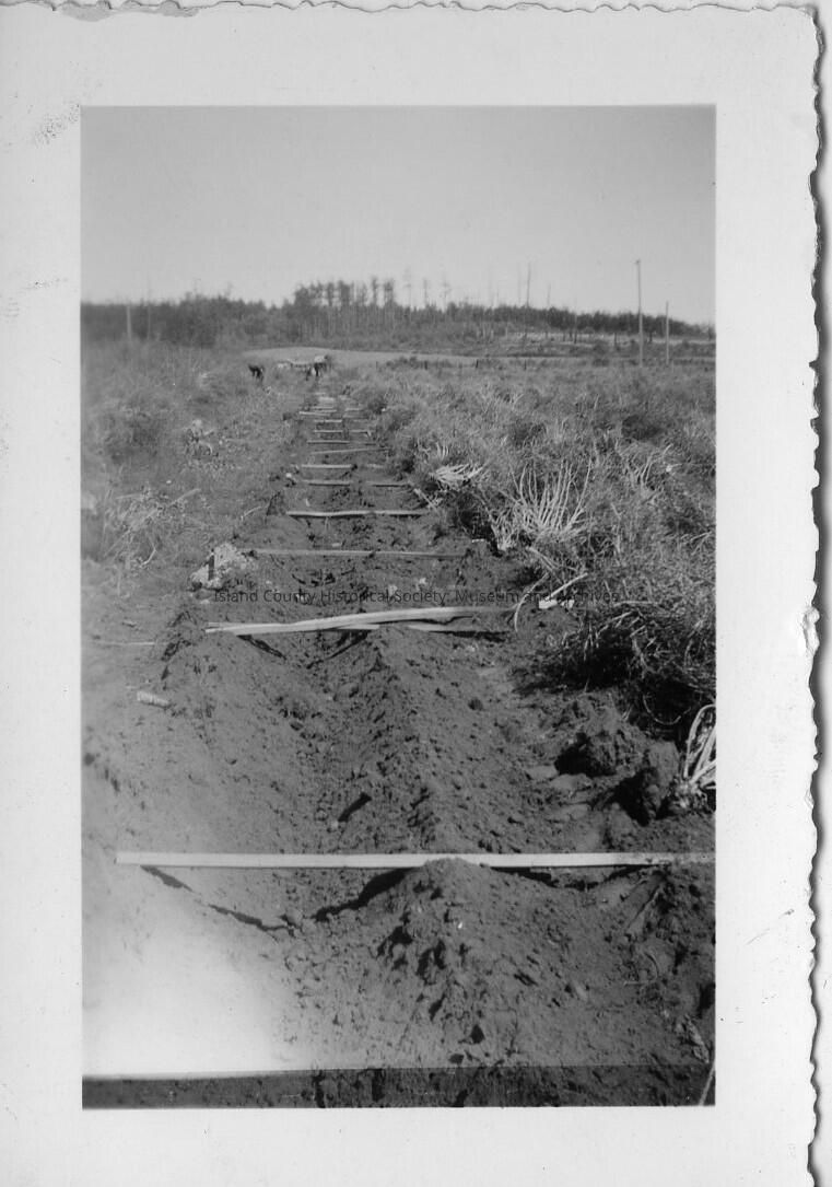 A photo of a ditch down a field. Across the ditch are thin boards spaced apart. Handwritten on the back is "Aug. 1939."
