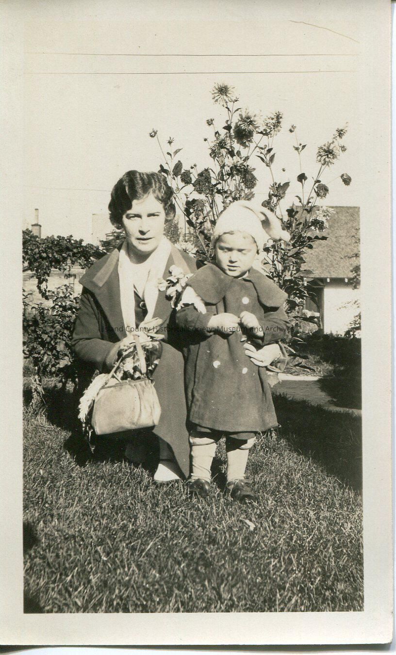 A woman kneeling beside a very young girl on grass. The woman is wearing a dark coat with flowers in the lapel and holding a handbag and gloves. The girl is wearing a white cap and a dark coat. In the background is a house and a tree.