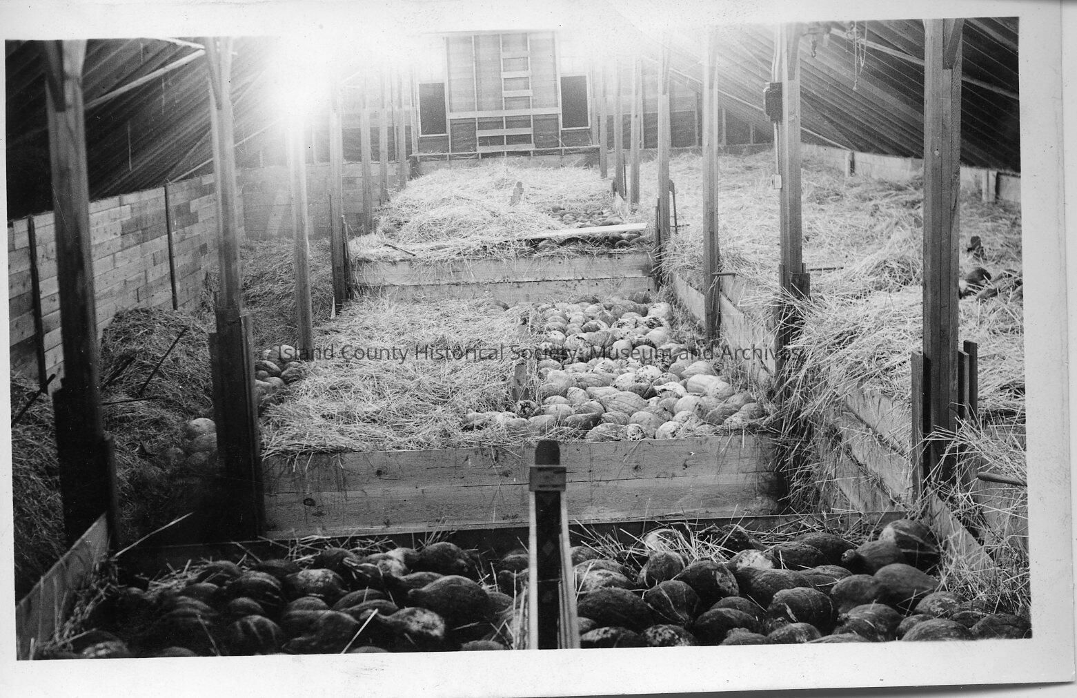 A photo of a barn with hay held by boards. In wooden carts are squash. Handwritten on the back is "Oct.5, 1938."