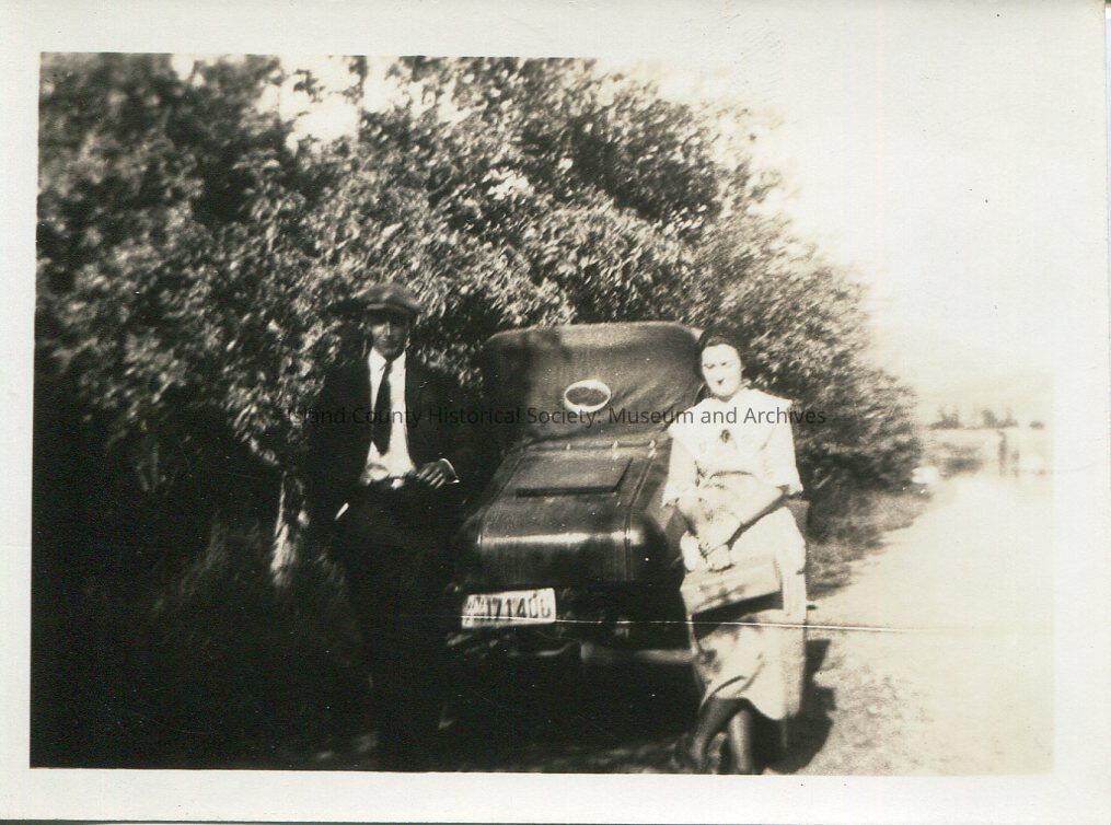 A man and a woman standing in front of the rear of a car which is surrounded by trees. The man is wearing a dark suit, white shirt and dark tie. The lady is wearing a white dress and is holding a large purse. The car is a convertible and has a license plate number 171400 mounted on the rear.