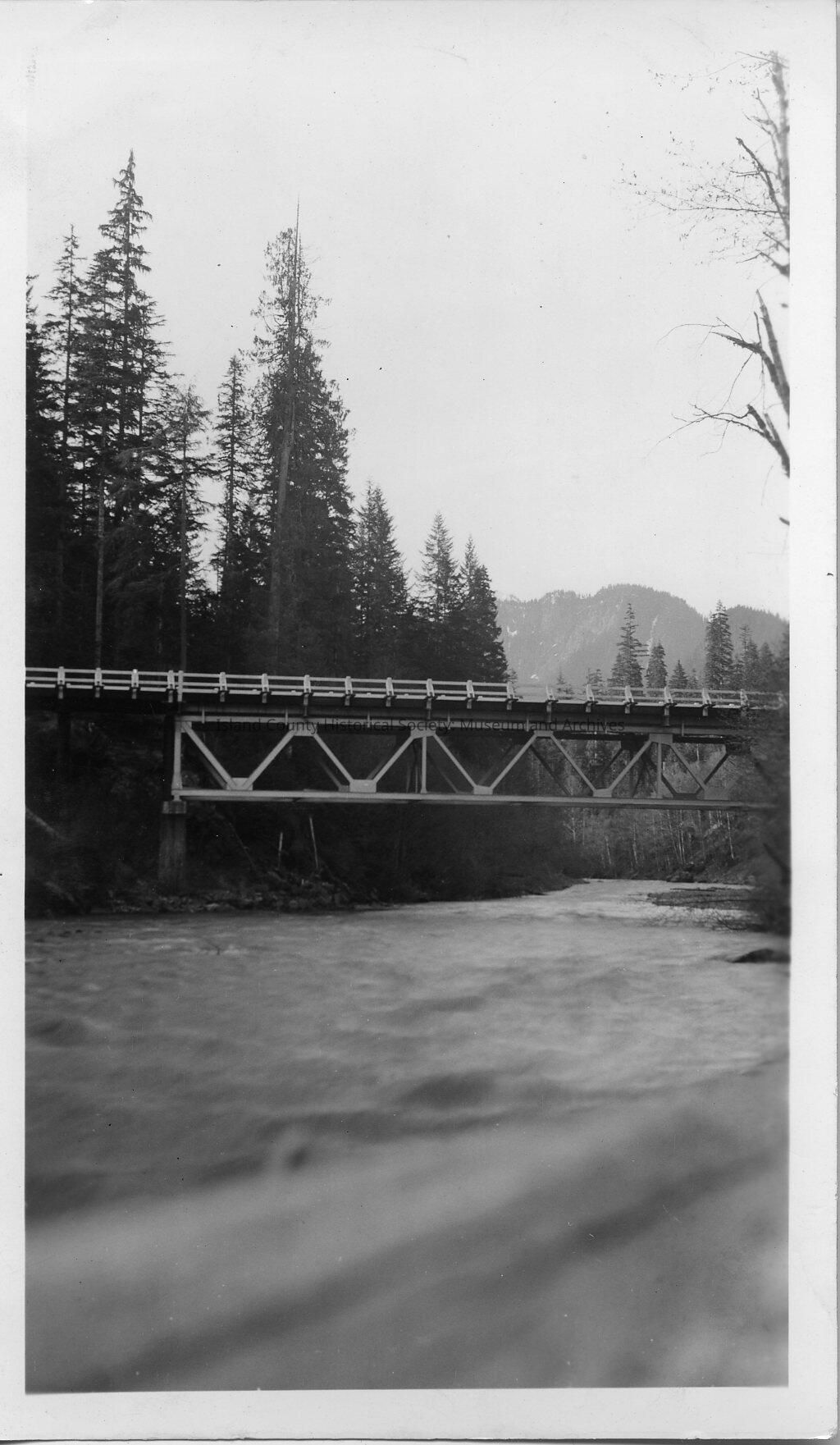 Black and white photo of a bridge over a river. There are several trees surrounding the bridge name and area is unknown. The picture was found in the Sherman Family pioneer family box. Handwritten on back is "April 30, 1939."