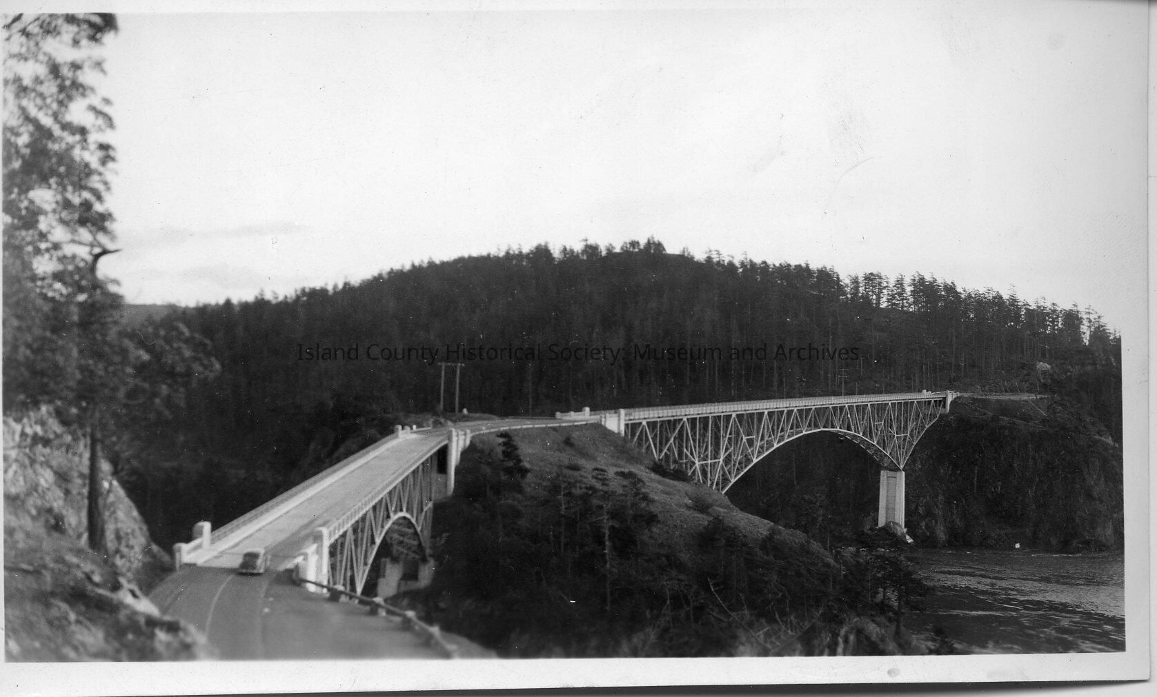 Black and white photo of Deception Pass Bridge. In the picture there are only 2 cars on the bridge and it is surrounded by trees. This photo was also found in the Sherman Family pioneer family files. Handwritten on the back is "Dec. 25, 1938."
