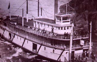 Photograph of a ferry carrying passengers. Likely c. early 1900s.