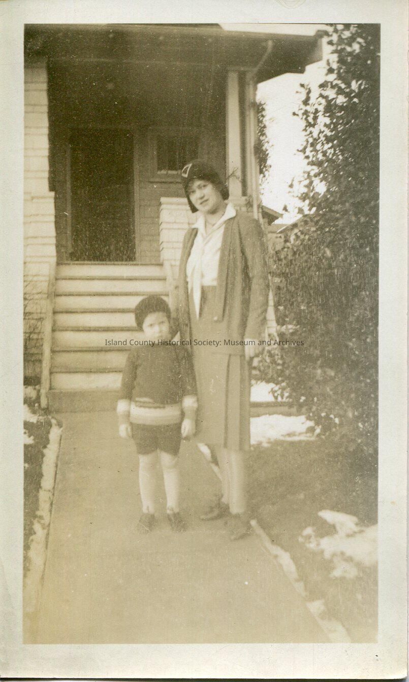 A young woman standing on a side walk in front of steps beside a young boy. The woman is wearing a hat with an emblem on it, a sweater over a white blouse and a skirt that appears to match the sweater. The young boy is wearing a dark cap, a dark top and dark short pants.