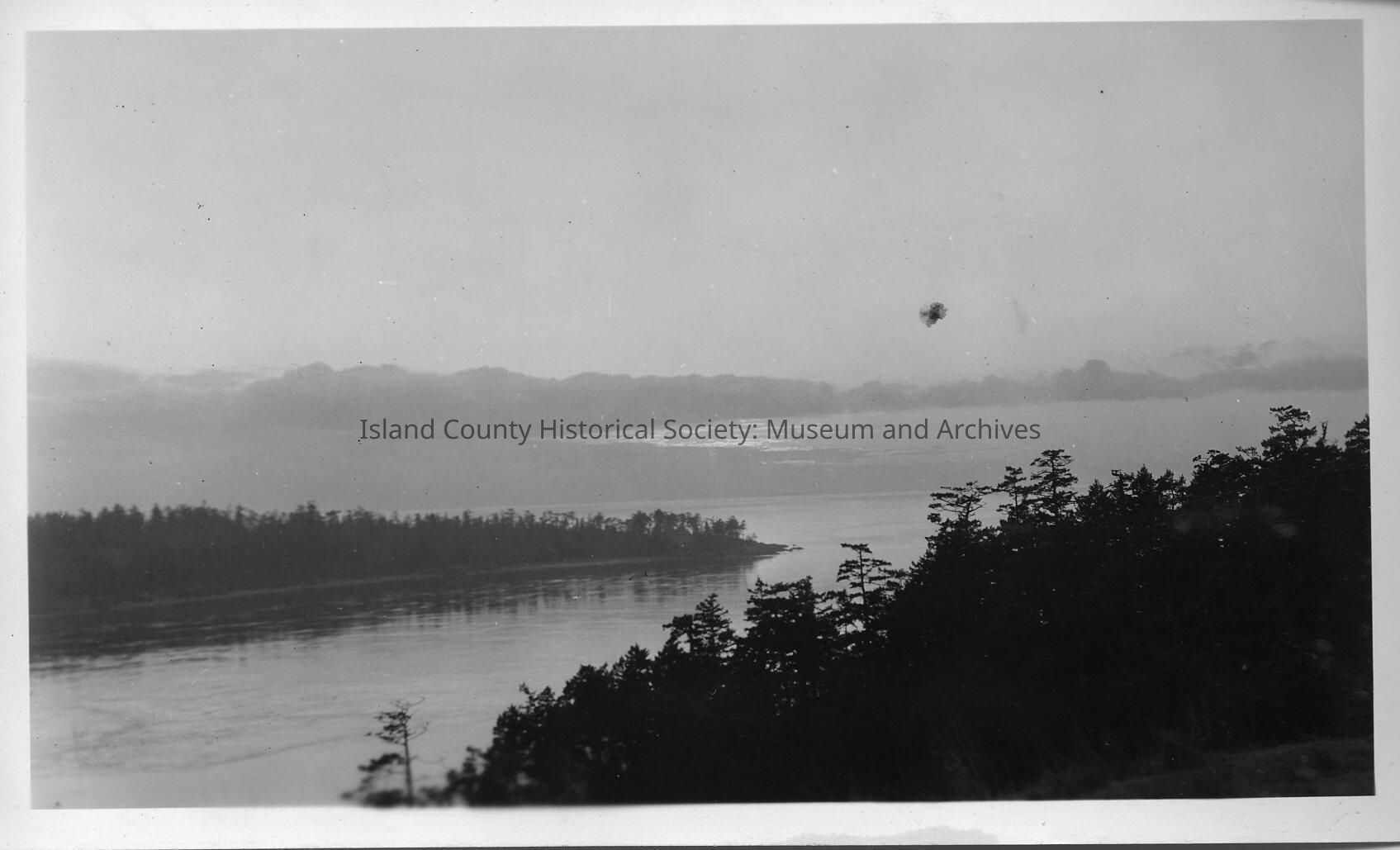 A photo of the lands and islands and waters of the Pacific North West. In the distance you can see Mt. Baker. Black and white photo found in the Sherman family files.