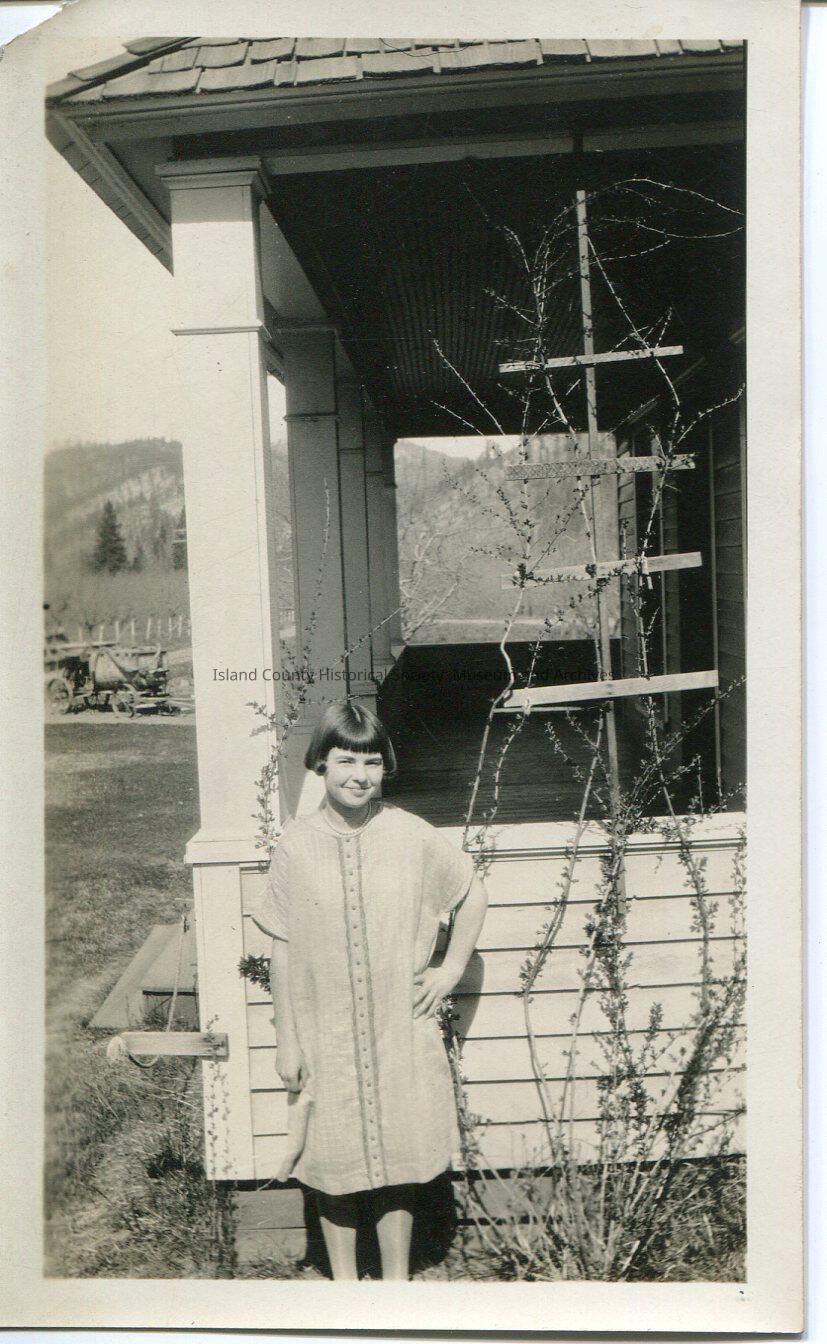 A young girl standing in front of a white porch wearing a pale dress with a large row of buttons down the front. To her right is a lattice holding a vine. In the background, to her left, is a tractor and above that is a hill with trees part way up.