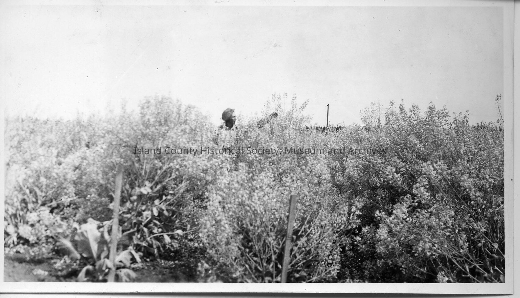 Black and white photo of a man standing in a flowering bushes and holding his arm high and has an unidentifying object. The photo was found in the Sherman family pioneer files. Handwritten on the back is "May 1939."
