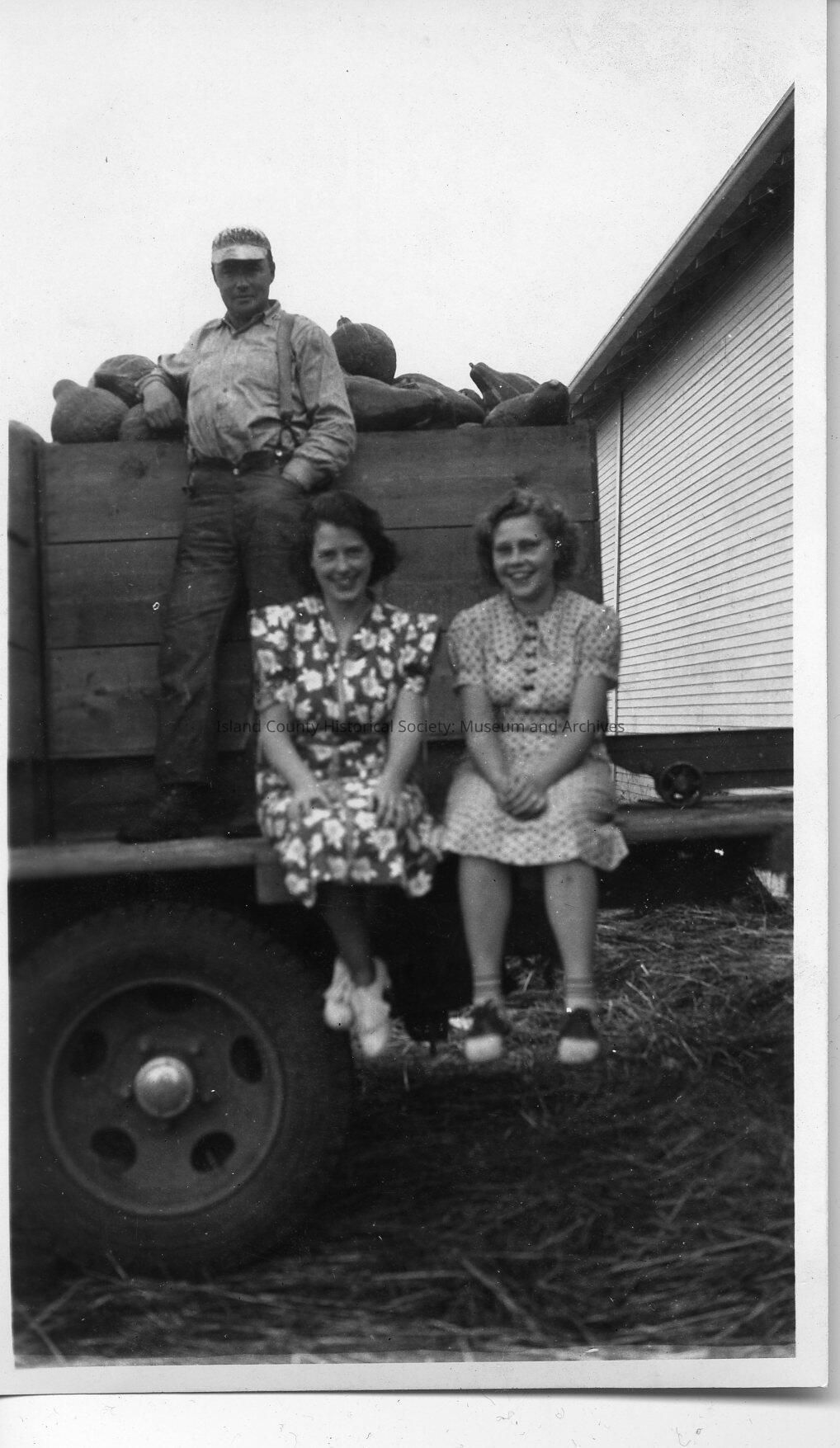 Black and white photo of a man standing on the back of a truck, and two ladies sitting down on the back. The produce in the truck looks like squash. The photo was found in the Sherman family pioneeer files. Handwritten on the back is Oct. 29, 1938."