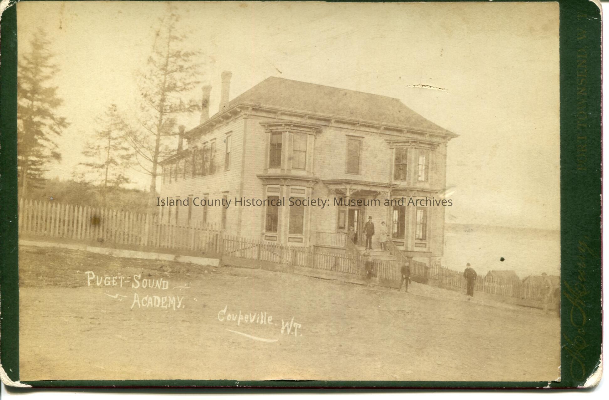 Puget Sound Academy with a man and woman standing on the porch and three men standing in front. To the left is a long picket fence. Printed on the front is "Puget Sound Academy Coupeville WA"