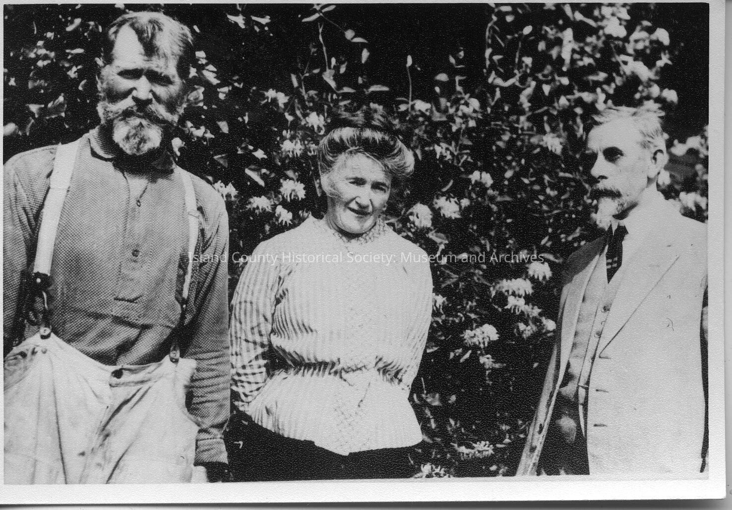 A black and white photo of E.H. and Elizabeth Sargent standing with H.B. Lovejoy. They appear to be standing outside in front of some bushes. Dr. Sargent is wearing suspenders, Elizabeth has a striped blouse with her hair piled into a bun and H.B. Lovejoy is wearing a suit with tie and vest.