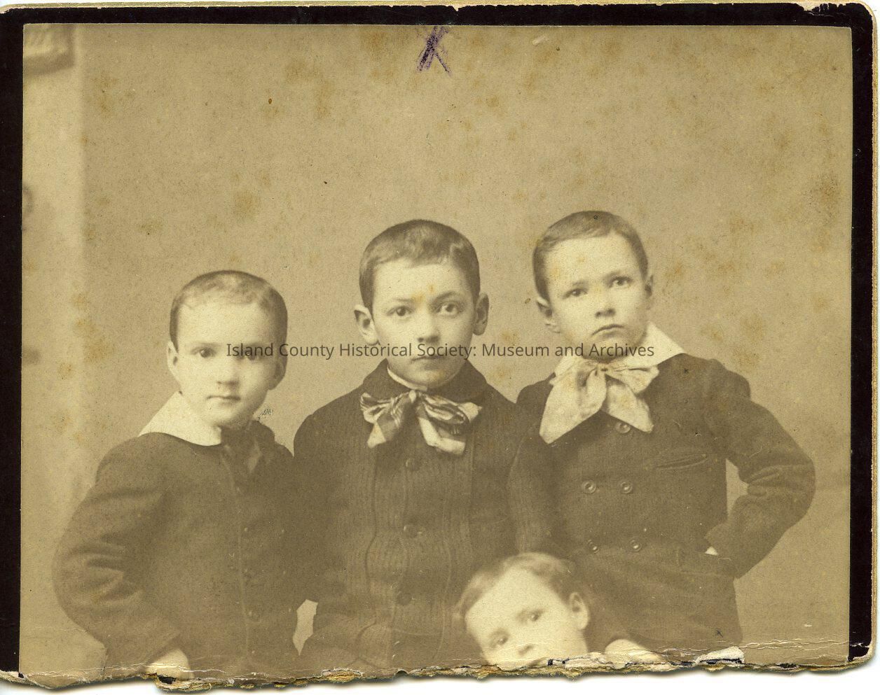 Black & white portrait photograph on cardboard backing of four young Gillespie boys: George, Carl, Roy, and Laurin. The boys are wearing dark colored suits and large bow ties. No date. The bottom half of the picture is torn in half and part of Laurin's head and body are missing.
