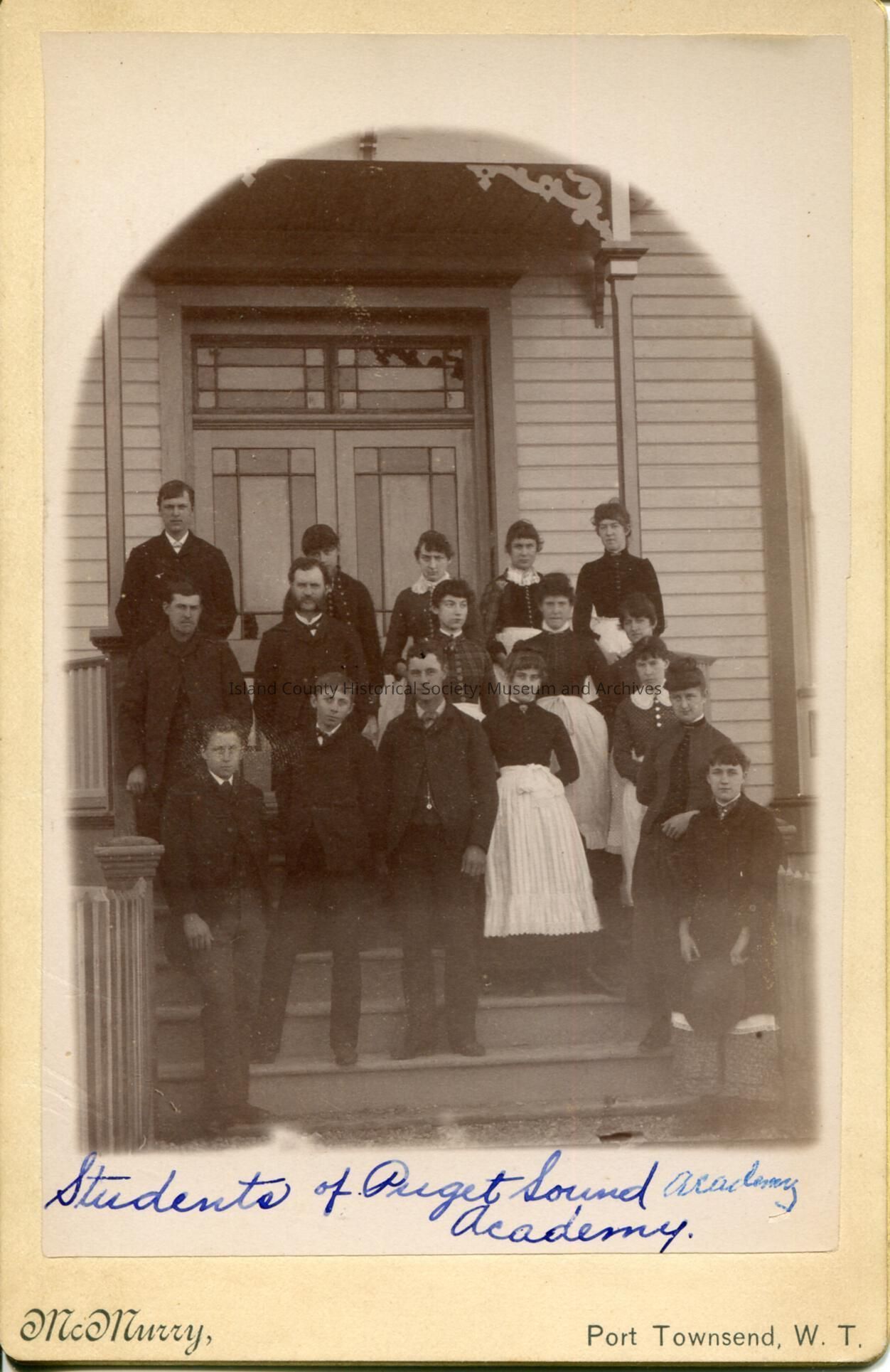 A picture of students standing on the steps of the Puget Sound Academy. Written on the front "Students of Puget Sound Academy" "McMurry Port Townsend, W.T." Written on the back " 1ST Puget Sound Academy"