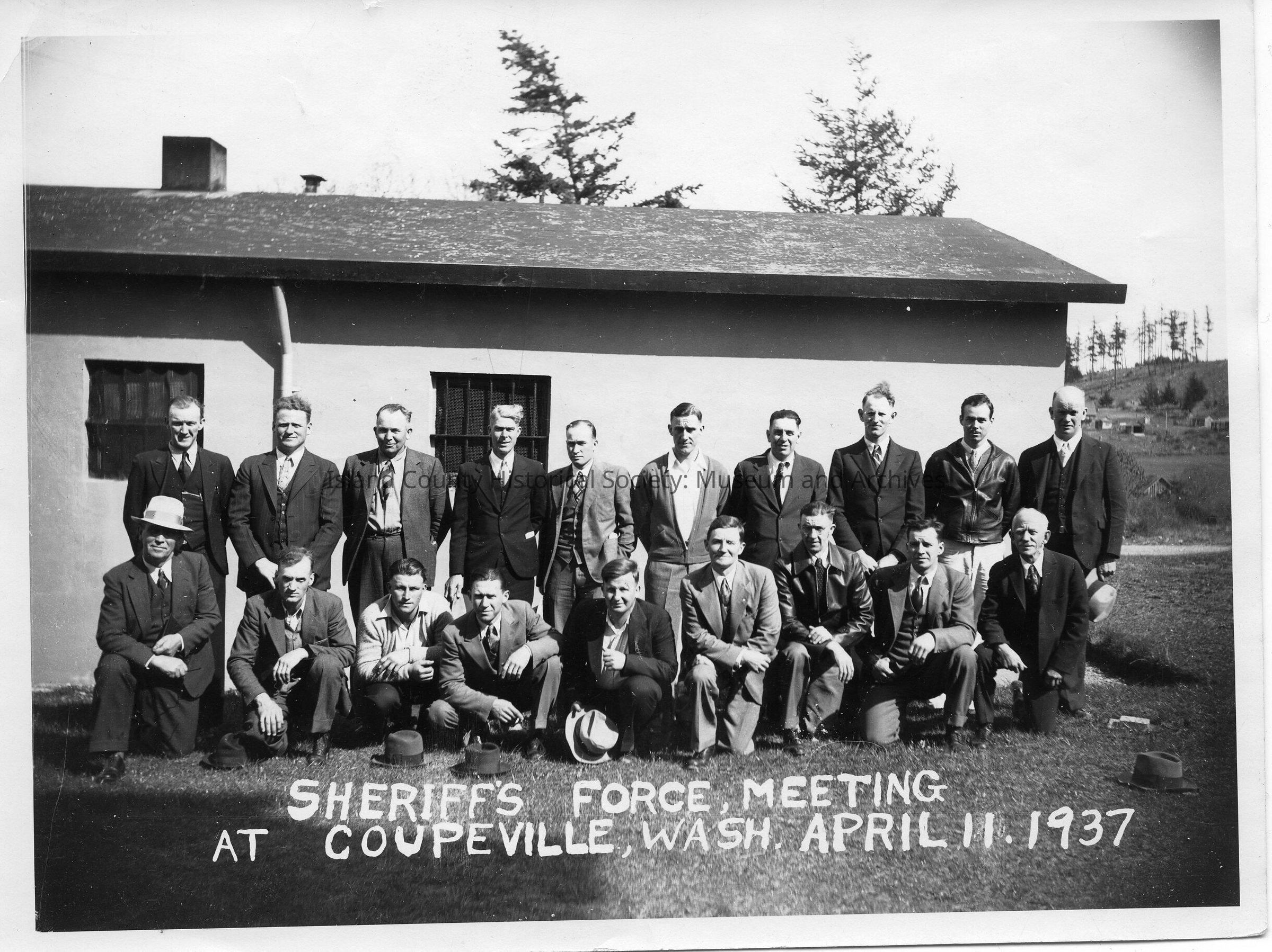 Sheriff's Force, Meeting at Coupeville, Wash., Aprill 11.1937. Back Row: Thomas W. Clark, Omar Porter - South Whidbey, Art Moa - Camano, Ivy/Vuy Vaughan, Clyde Baker, Harry Walters, Jess Vogel - Camano, Tom Koetje - lives in O.H., Daryl "Hike" Willard, Ronald _____. Front Row: Perry Grove, Dave _____, Stan McDonald, Norm Quigley, Art Black, Albert Johnson, Bob Austin, Andy Vanderstoep, Billy Douglass , O.H. Perry Grove. Photographer at Old Jail House.