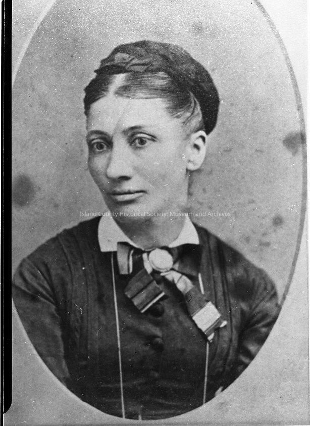Portrait of woman with hair pulled up into close hat and bow at neckline. Kineth.