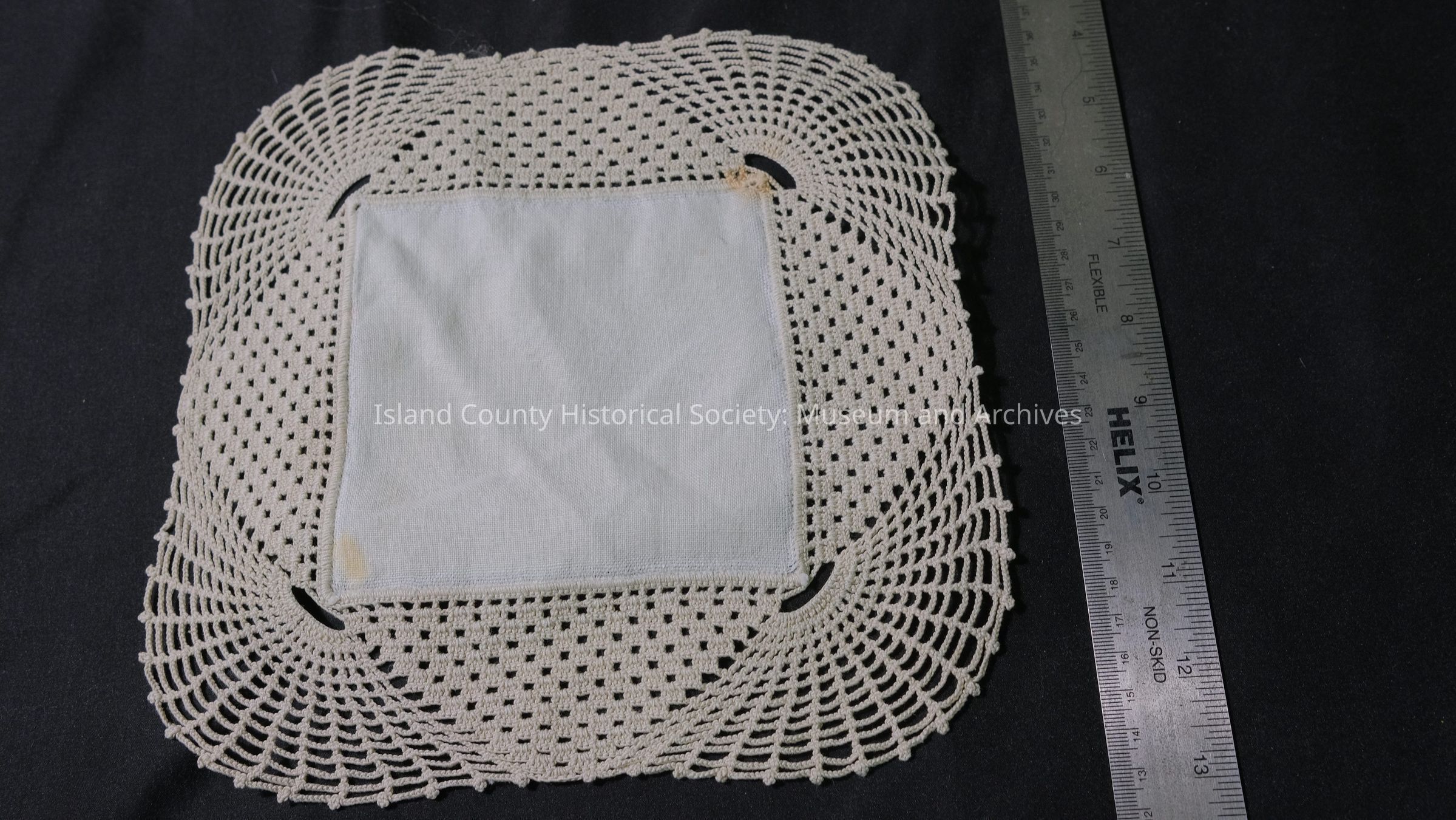Doily, linen center with crocheted edge.