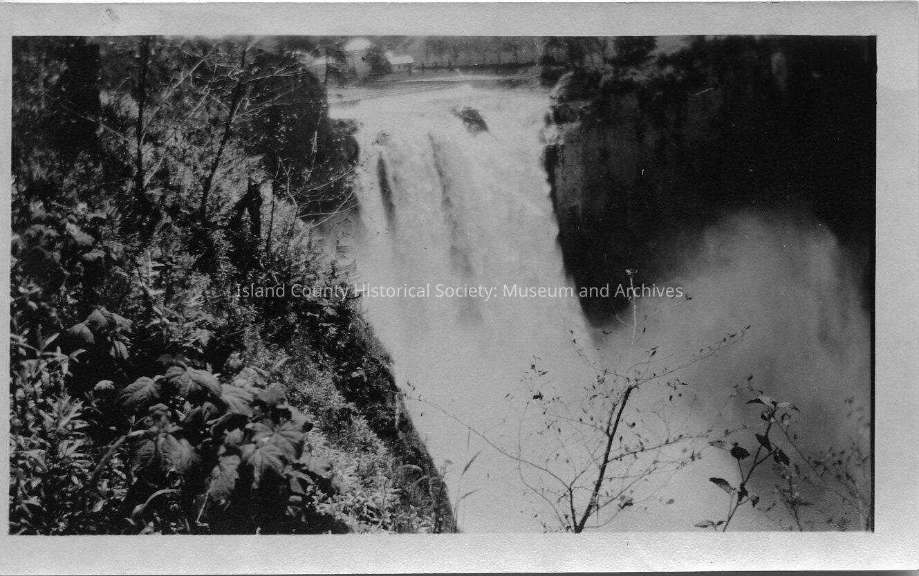 Black & white photo (landscape) of waterfalls, most likely Snoqualmie Falls. No date on photo.