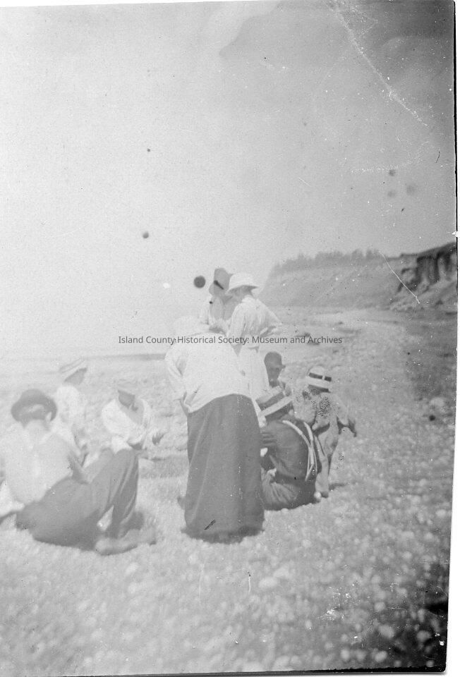 Black & white group photo of men, women, and children on the beach. Appears to be Ebey's Bluff in the background. No names or dates on the photo.